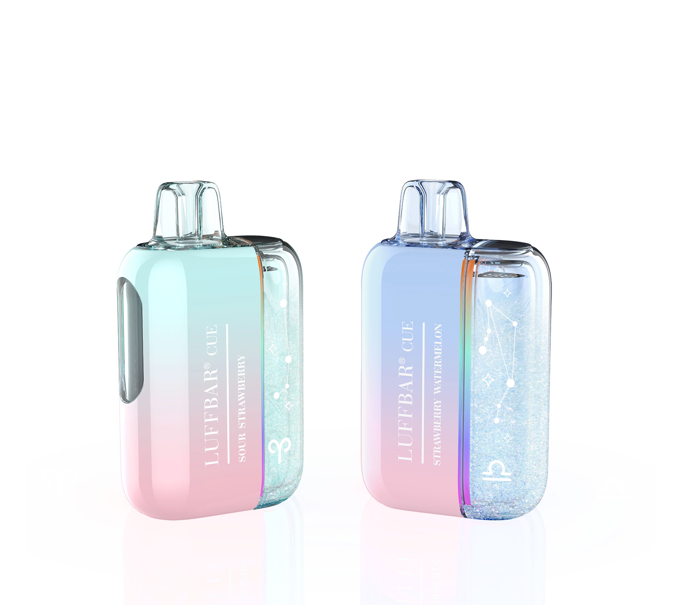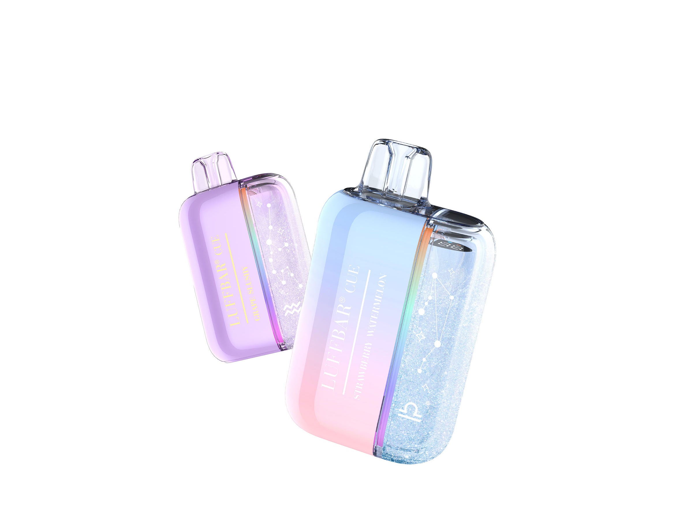 What is the Shaker Glitter feature? LUFFBAR embedded real glitter particles inside the transparent housing of the Cue 60K. When you pick up or shake the device, the glitter actually moves and shifts — each flavor has its own matching glitter color. It's a visual design feature built into the device itself, not a coating or sticker. Every device in the Cue 60K lineup has it.