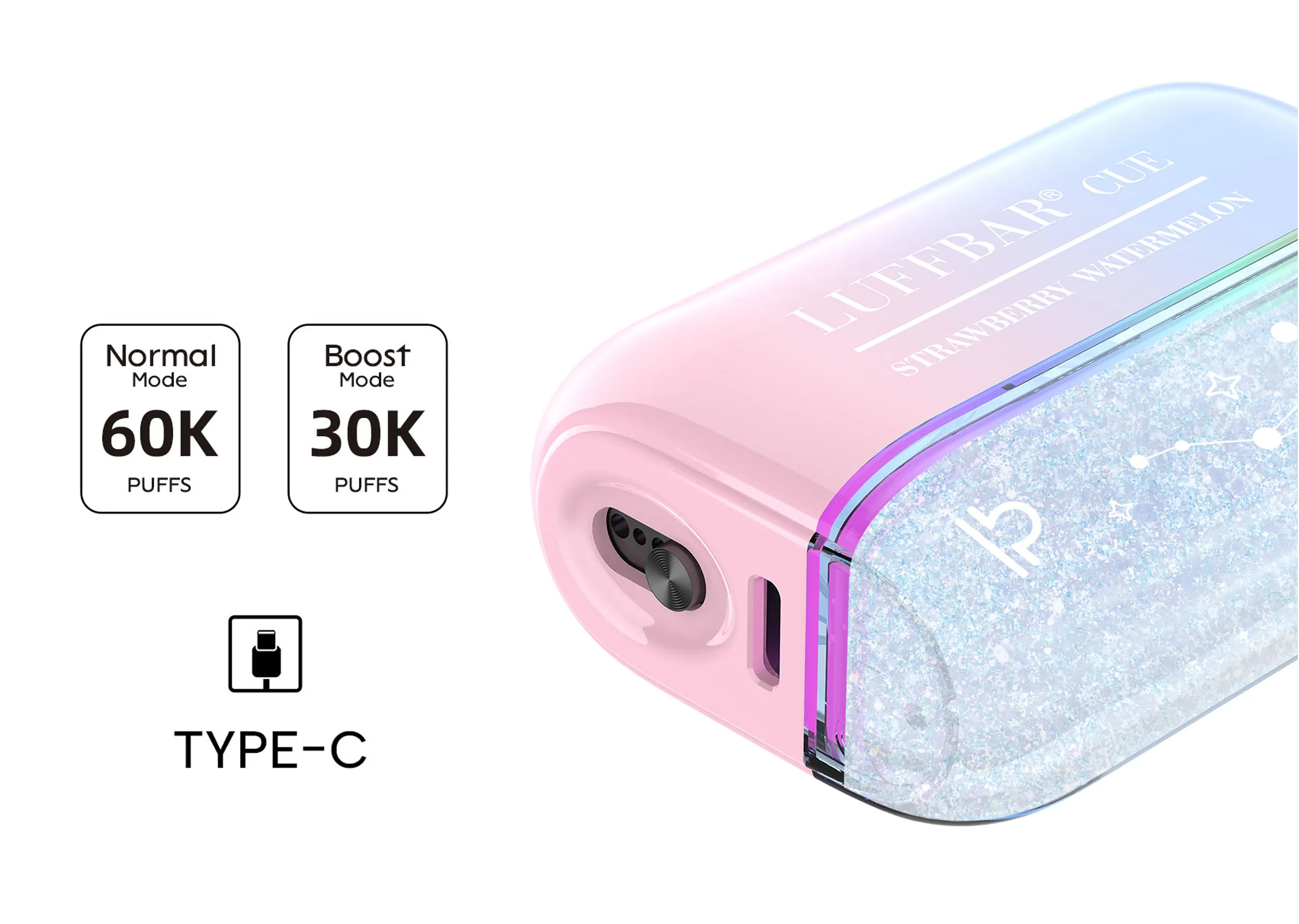 The Luff Bar Cue 60K arrives as one of the most visually striking and technically capable disposables LUFFBAR has built — and it earns that description across every detail. The headline spec is the 60,000 puffs in Normal Mode, achieved through a high-efficiency mesh coil and a 650mAh USB Type-C rechargeable battery that keeps output consistent from the first draw to the last. Flip to Boost Mode for 30,000 puffs of denser, warmer vapor when you want more presence on the inhale. The device is draw-activated with adjustable airflow, an LED display for real-time mode and battery visibility, and the standout feature of the entire lineup: a Shaker Glitter body that moves and shifts every time you pick it up. This is a device that looks as good as it performs.